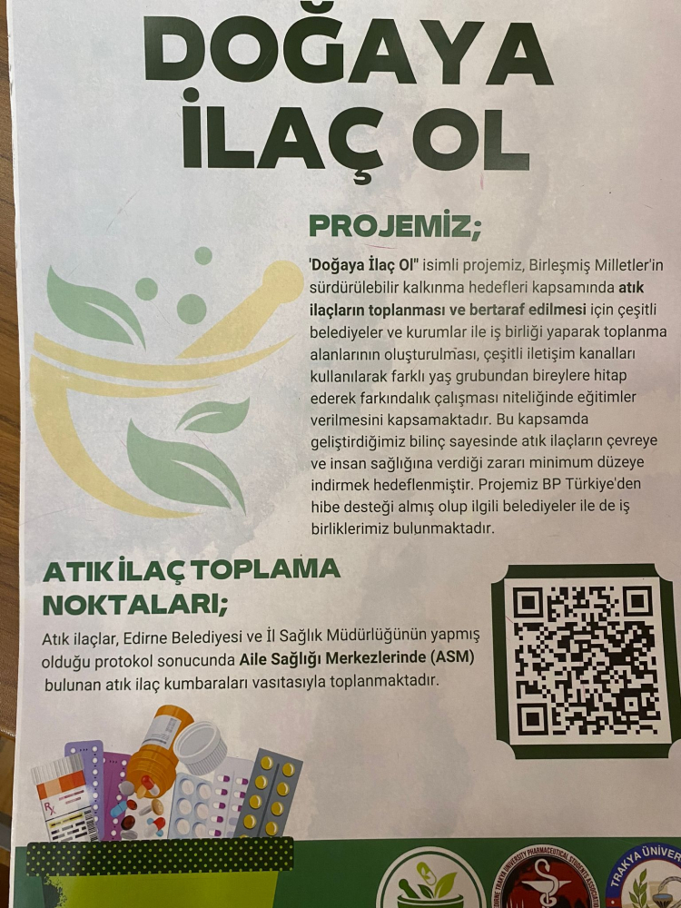 Trakya Üniversitesi Eczacılık Öğrencileri Birliği (ETUPSA), çevre bilincini artırmayı ve doğayı korumayı hedefleyen “Doğaya İlaç Ol” projesini hayata geçirmeye devam ediyor. Proje kapsamında, atık ilaçların doğru şekilde toplanarak imha edilmesi ve halkın bu konuda bilinçlendirilmesi amaçlanıyor.