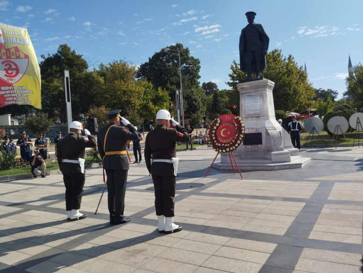 Edirne Valisi Yunus Sezer, Garnizon Komutanı Tuğgeneral Muharrem Eminoğlu ve Belediye Başkanı Av. Filiz Gencan Akın'ın Atatürk anıtına çelenk sunması ile başlayan törende Edirne Belediye Bandosu eşliğinde Türkiye Cumhuriyeti'nin kurucusu Mustafa Kemal Atatürk, silah arkadaşları ve tüm şehitler anısına 1 dakikalık saygı duruşunda bulunularak, İstiklal Marşı okundu. Saygı duruşu sırasında Edirne'de hayat 1 dakikalığına dururken; anıt çevresinde bulunan vatandaşların İstiklal Marşı'na da coşkuyla eşlik ettikleri görüldü.