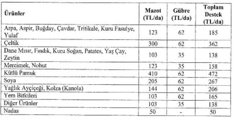Karara göre; arpa, aspir, buğday, çavdar, tritikale, kuru fasulye ve yulaf için çiftçilere dekar başına 123 lira mazot, 62 lira gübre olmak üzere 185 lira destek ödemesi yapılacak. Çeltikte dekar başına 300 lira mazot ve 62 lira gübre desteği olmak üzere toplam 362 lira ödenecek. Dane mısır, fındık, kuru soğan, patates, yaş çay ve zeytinde mazot desteği 103 lira, gübre desteği 35 lira olmak üzere toplam 138 lira destek verilecek. Mercimek ve nohutta 123 lira mazot, 35 lira gübre olmak üzere toplam 158 lira destek verilecek. Kütlü pamukta mazot desteği 410 lira, gübre desteği 62 lira olmak üzere 472 lira destek verilecek. Soyada 205 lira mazot desteği, 62 lira gübre desteği olmak üzere toplam 267 lira destek verilecek.