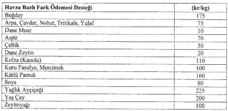 Havza bazlı fark ödemesi desteği, kilo başına buğdayda 175 kuruş, arpa, çavdar, nohut, tritikale ve yulafta 75 kuruş, dane mısırda 10 kuruş, aspirde 70 kuruş, çeltikte 30 kuruş, dane zeytinde 20 kuruş, kanolada 110 kuruş, kuru fasulye ve mercimekte 100 kuruş, kütlü pamukta 160 kuruş, soyada 80 kuruş, yağlık ayçiçeğinde 225 kuruş, yaş çayda 200 kuruş ve zeytinyağında 100 kuruş oldu.