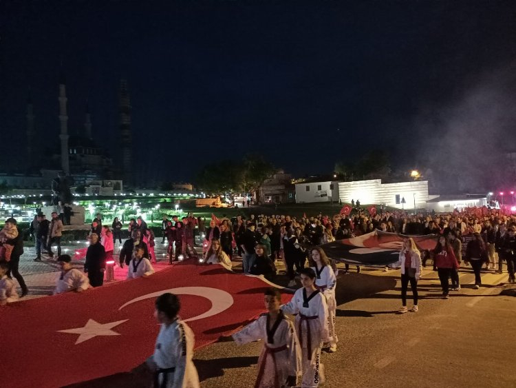 Dev Türk bayrağı, dev Atatürk portresi ve Edirne Belediye Bandosu’nun marşları eşliğinde yürüyüşe başlayan fener alayı korteji, Selimiye Camii meydanına ulaştığında meşalelerle karşılanırken; katılımcılar marşlara eşlik etti. Selimiye Camii meydanının ardından kortej, Atatürk anıtında yürüyüşü tamamladı. Yürüyüşün ardından Türkiye Cumhuriyeti’nin kurucusu Mustafa Kemal Atatürk, silah arkadaşları ve tüm şehitler anısına 1 dakikalık saygı duruşu ve İstiklal Marşı’nın okunması ile devam eden etkinlikte Belediye Başkanı Akın, günün anlam ve önemi ile ilgili konuşma yaptı.