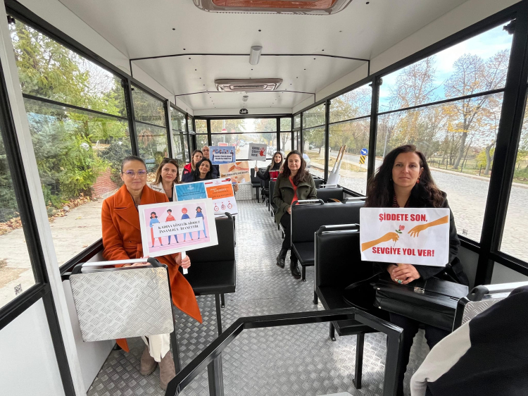 Nostaljik tramvay görünümlü "gezi treni" ile kenti gezen muhtarlar tur esnasında "Şiddete Son Sevgiye Yol Ver" ve "Kadına Yönelik Şiddet İnsanlığa İhanettir" yazılı dövizler taşıdı.