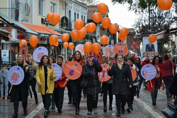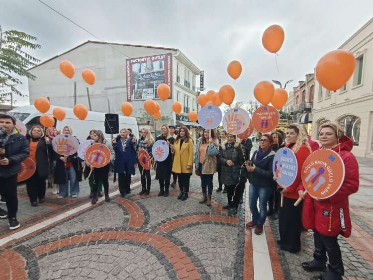 Yardımcı’nın konuşmasının ardından katılımcılar, ellerindeki kadın haklarına dikkat çeken dövizler ve turuncu balonlarla Saraçlar Caddesi’nde yürüyüş gerçekleştirdiler. Katılımcılar, Saraçlar Caddesi’ndeki pehlivanlar heykeline geldikleri sırada ise turuncu balonları gökyüzüne bıraktılar. Katılımcılar, daha sonra Saraçlar Caddesi üzerinden Atatürk anıtına yürüyerek etkinliği tamamladılar.