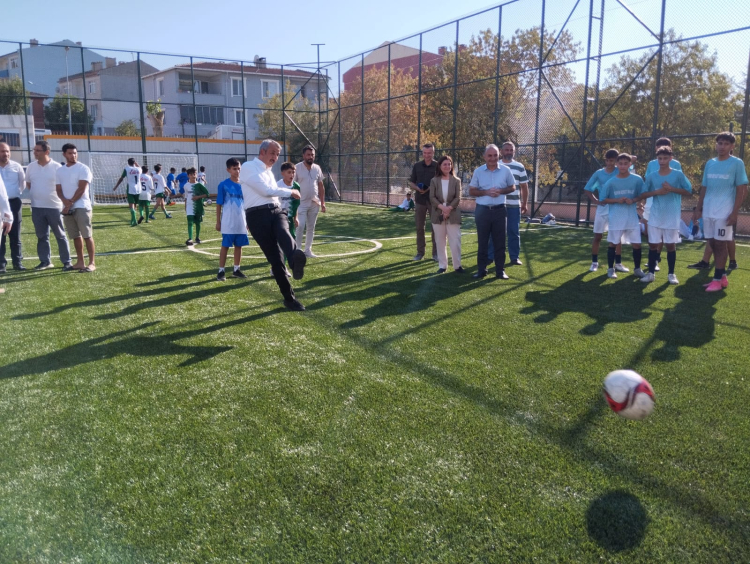 Açıklamaların ardından Edirne Valisi Yunus Sezer, futbol oynayan çocuklarla beraber kaleye şut çekti ve sohbet etti.