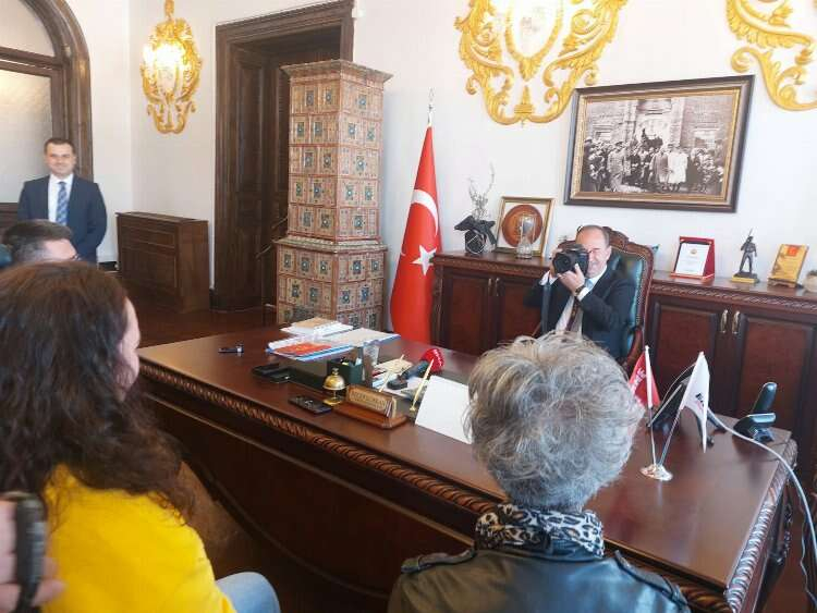 Gerçekleştirilen toplantıda bir basın mensubunun fotoğraf makinesini inceleyen Gürkan, fotoğraf makinesi ile basın mensuplarının fotoğrafını çekmeyi ihmal etmedi.