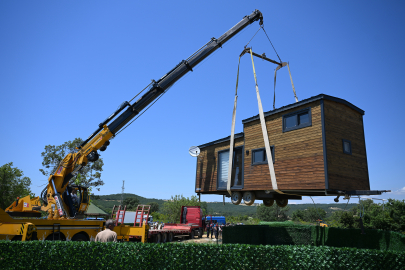 Vinç yardımıyla yerinden alınarak tırlara yüklenen "tiny house"lar, sahiplerinin teslim alması için Koruklu köyünde belirlenen alana götürüldü.