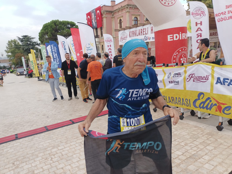 Edirne’de bu yıl 9’uncusu düzenlenen Uluslararası Edirne Maratonu'nun 10 kilometre kategorisine 79 yaşındaki Ahmet Poyraz katıldı.