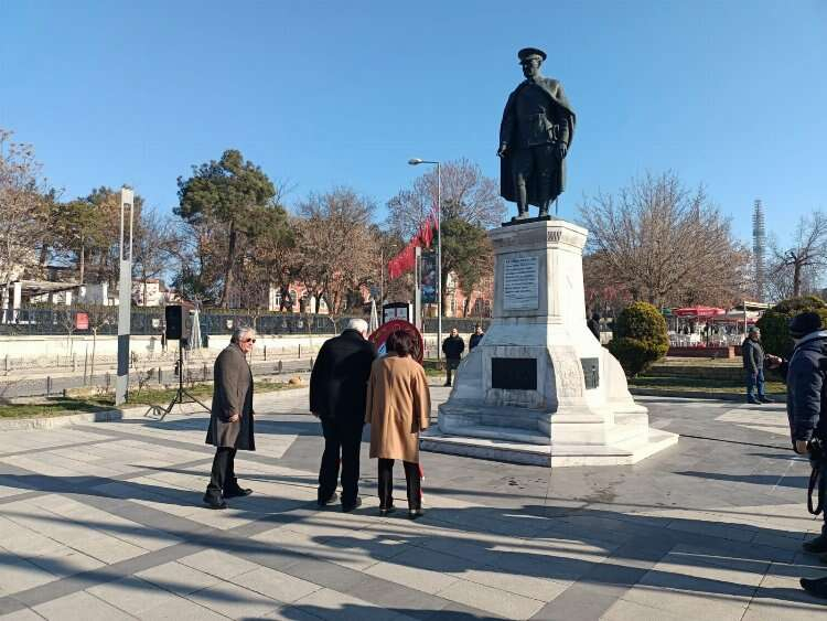 Edirne Belediye Bandosu eşliğinde belediye binası önünden pankart ve dövizlerle Atatürk anıtına yürüyen kortej, Atatürk anıtına geldi. ADD Edirne Şube Başkanı Celil Özcan’ın anıta çelenk sunması ile devam eden törende Türkiye Cumhuriyeti’nin kurucusu Mustafa Kemal Atatürk, silah arkadaşları ve tüm şehitler anısına 1 dakikalık saygı duruşu ve İstiklal Marşı okundu. İstiklal Marşı’nın okunmasının ardından tören, Uğur Mumcu Parkı’nda devam etti.