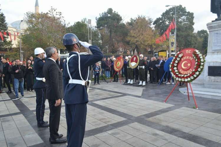 Edirne Valisi Yunus Sezer, Edirne Milletvekilleri Ahmet Baran Yazgan ve Mehmet Akalın, Edirne Garnizon Komutanı Tuğgeneral Berat Acar, Edirne Belediye Başkanı Recep Gürkan, kamu kurum temsilcileri, siyasi parti ve sivil toplum örgütlerinin temsilcileri ile 7’den 70’e birçok Edirnelinin katıldığı anma programında ayrıca Atatürk anıtına çelenk sunulurken; Edirne Belediye Bandosu eşliğinde İstiklal Marşı okundu. Atatürk anıtındaki programın ardından anma programı Edirne Belediye binasındaki Atatürk Odası’nı ziyaret ile devam etti.