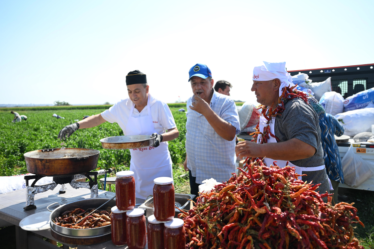 Sıcak havada başlayan hasat mesaisinde işçilere ekmek arası tava ciğer ve hasat ettikleri biberin kurutulmuşu ikram edildi.