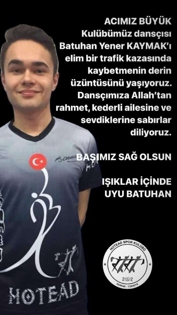 HOTEAD Gençlik ve Spor Kulübü Derneği’nden yayımlanan baş sağlığı mesajında da; “Acımız büyük. Kulübümüz dansçısı Batuhan Yener Kaymak’ı elim bir trafik kazasında kaybetmenin derin üzüntüsünü yaşıyoruz. Dansçımıza Allah’tan rahmet, kederli ailesine ve sevdiklerine sabırlar diliyoruz. Başımız sağ olsun. Işıklar içinde uyu Batuhan” sözlerine yer verildi.