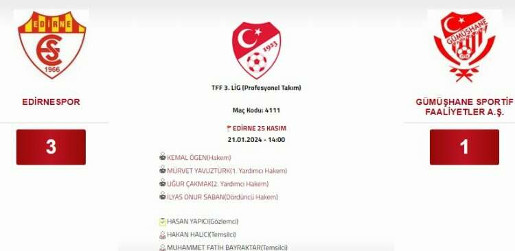 Sarı kırmızılılar, 16’ncı hafta maçında Gümüşhane Sportif Faaliyetler A.Ş. ile 25 Kasım Stadı’nda karşılaştı. Edirne’de bugün 14.00’te başlayan karşılaşmayı hakem Kemal Ögen yönetti. Ögen’İn yardımcılıklarını Mürvet Yavuztürk, Uğur Çakmak ve İlyas Onur Saban yaptı.