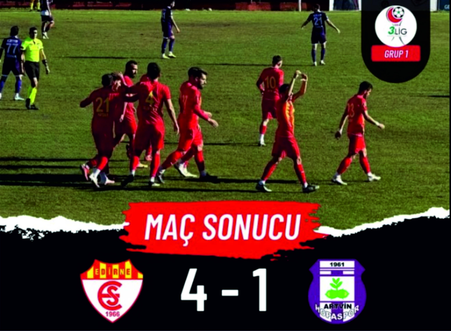 Edirnespor, karşılaşmanın ikinci 45 dakikasına 3-0’lık skor ile rahat başladı. Ataklarına devam eden sarı kırmızılılarda Alperen Doğan, 53’üncü dakikada 2’nci golü bularak takımını 4-0 öne geçirdi. Maçın 77’nci dakikasında ise Artvin Hopaspor’dan Mehmet Aytemiz, takımının ilk golünü kaydederek karşılaşmayı 4-1’e getirdi. Karşılaşmada başka gol olmazken, Edirnespor 4-1’lik skor ile evinde 3 puan almanın mutluluğunu yaşadı.
