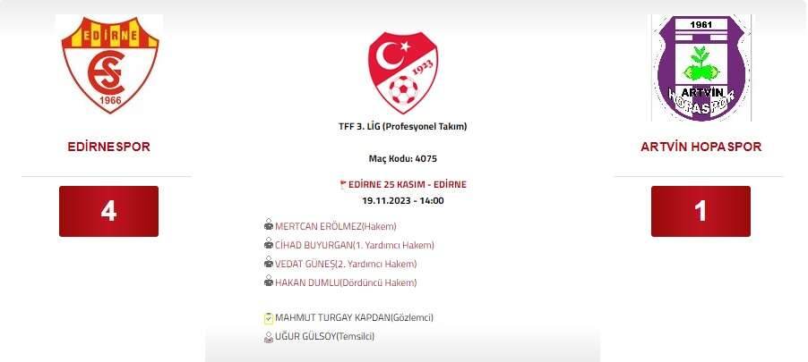TFF 3. Lig A Grubu’nda mücadele eden Edirnespor, 11’inci hafta karşılaşmasında Artvin Hopaspor ile evinde karşılaştı. 25 Kasım Stadı’nda bugün saat 14.00’te başlayan karşılaşmayı Mertcan Erölmez yönetti. Erölmez’in yardımcılıklarını ise Cihad Buyurgan, Vedat Güneş ve Hakan Dumlu yaptı.