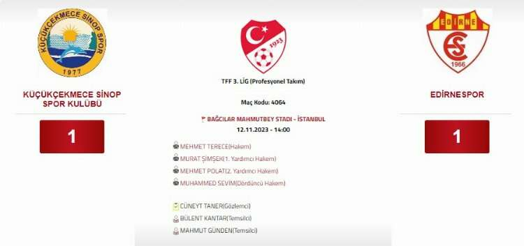 TFF 3. Lig A Grubu’nda mücadele eden Edirnespor, 10’uncu hafta karşılaşmasında Küçükçekmece Sinop Spor Kulübü ile deplasmanda karşılaştı. Bağcılar Belediyesi Mahmutbey Stadı’nda bugün 14.00’te başlayan karşılaşmayı hakem Mehmet Terece yönetti. Terece’nin yardımcılıklarını ise Murat Şimşek, Mehmet Polat ve Muhammed Sevim yaptı.