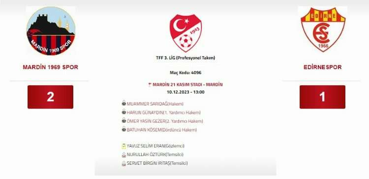 TFF 3. Lig A Grubu’nda mücadele eden Edirnespor, 14’üncü hafta maçında Mardin 1969 Spor ile deplasmanda karşılaştı. Mardin 21 Kasım Stadı’nda bugün 13.00’te başlayan karşılaşmayı hakem Muammer Sarıdağ yönetti. Sarıdağ’ın yardımcılıklarını ise Harun Günaydın, Ömer Yasin Gezer ve Batuhan Kösem yaptı.