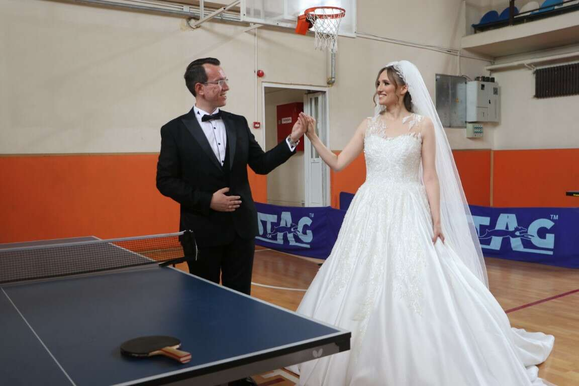 Gelinlik ve damatlığını giyen çift, 19 Mayıs Atatürk'ü Anma, Gençlik ve Spor Bayramı dolayısıyla Ekrem Demiray Spor Salonu'nda düzenlenen masa tenisi turnuvasını izledi.