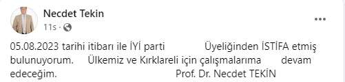Tekin, sosyal medya hesabından yaptığı duyuruda; “05.08.2023 tarihi itibarı ile İYİ Parti Üyeliğinden istifa etmiş bulunuyorum. Ülkemiz ve Kırklareli için çalışmalarıma devam edeceğim” ifadelerini kullandı.
