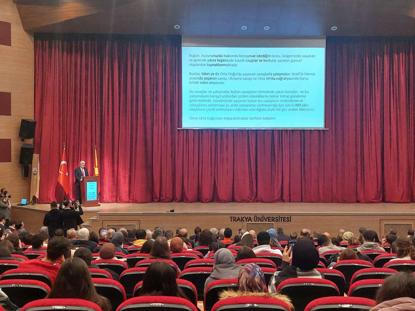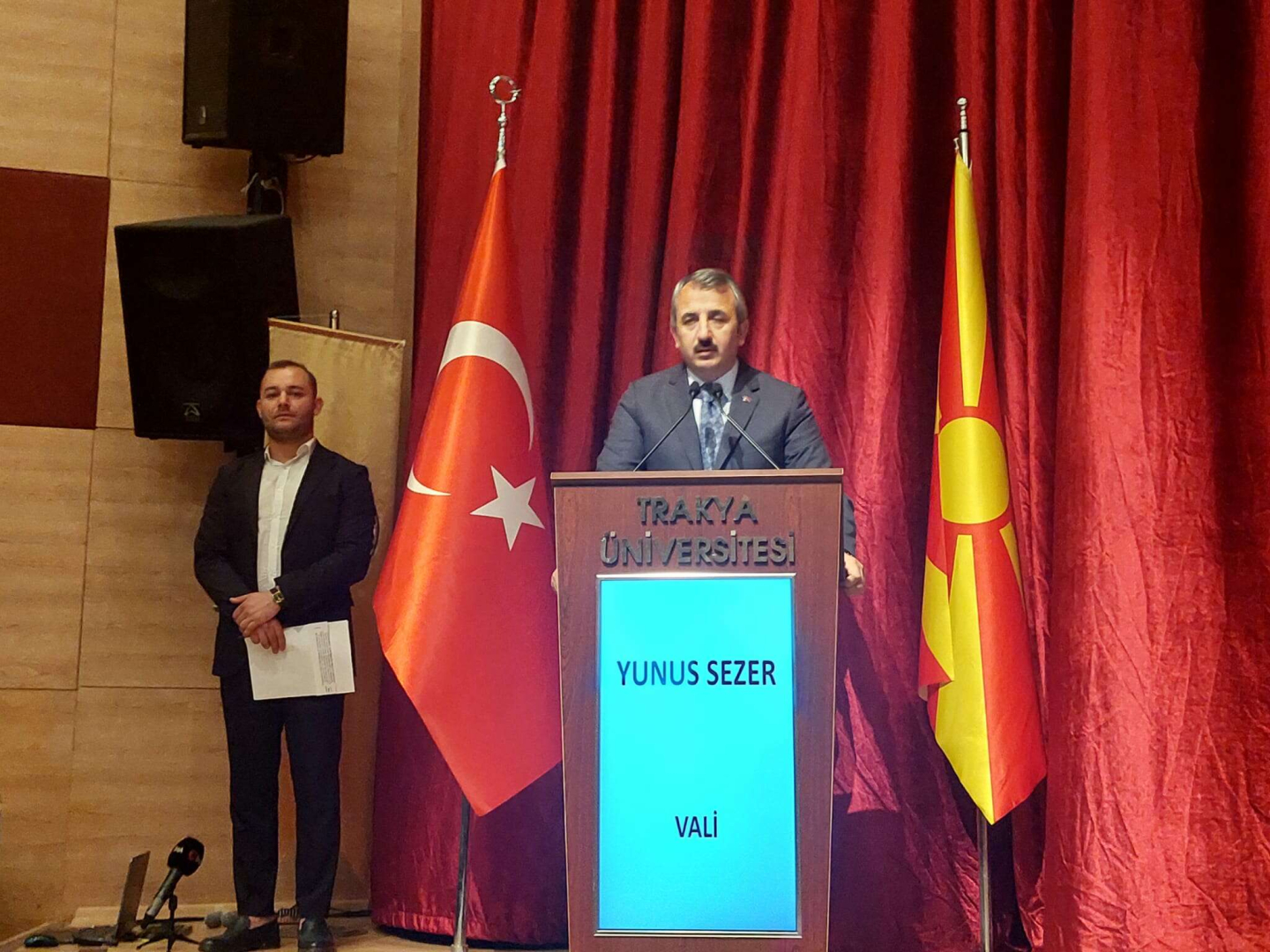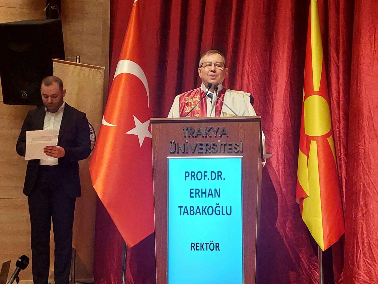 Trakya Üniversitesi’nin Makedonya ile ikili çalışmaları olduğuna değinen Trakya Üniversitesi Rektörü Prof. Dr. Erhan Tabakoğlu, “Edirne Osmanlıyı en iyi anlatan şehir. Fatih’in doğup büyüdüğü bir şehir. 56 bilinen medresesi ile eğitim kurumlarının pek çoğunu bünyesinde barındıran, eğitimin hep önemli olduğu bir şehirdir. Bu şehir aslında bir Balkan şehri. Balkan coğrafyasındaki bütün önemli özellikleri bünyesinde bulunduruyor. Ve Selimiye’siyle Osmanlı’nın en önemli eseridir. Fakat sinagoguyla, kilisesiyle, bir imparatorluk şehri. Biz bir arada yaşama imtihanını kazanmış göstermiş bir şehiriz. 500 yıl dünyanın en zor coğrafyalarında barış yaşatmış medeniyetin başkentliğini yapmış bir şehir. Makedonya ile ilişkilerimiz üniversite olarak oldukça köklü ve eski. Üniversitemizde 159 Makedonyalı öğrencimiz üniversitemizde eğitim görüyorlar. Makedonya üniversitelerinin bir çoğunla ikili anlaşmalarımız var. Balkan Üniversiteler Birliği ile faaliyetlerimiz devam ediyor. Dünya zor bir dönemden geçiyor. Biliyorsunuz Gazze’de bir insanlık dramı yaşanıyor. Çocuklara, kadınlara, hastalara maalesef ateşler atılıyor ve dünyanın gözünde öldürülüyorlar. İşte bu zaman içerisinde de bu toplantının çok önemli olduğunu düşünüyorum” dedi.