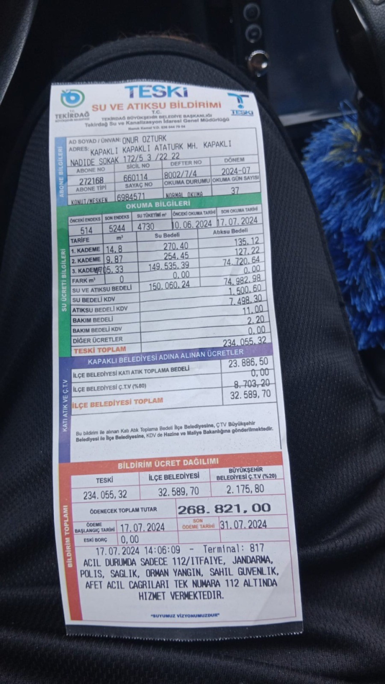 Faturada yazan rakamı görür görmez Tekirdağ Büyükşehir Belediyesi Su ve Kanalizasyon İdaresi'ni (TESKİ) arayan Onur Öztürk, “Su faturalarının yazıldığını görünce bize bu ay kaç lira fatura gelmiş diye faturamı almaya gittim. İncelemek için eve çıktığımda ilk olarak 268 lira olduğunu düşündüm fakat biraz daha incelediğim zaman 268 bin lira fatura geldiğini gördüm" diye konuştu.