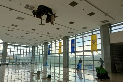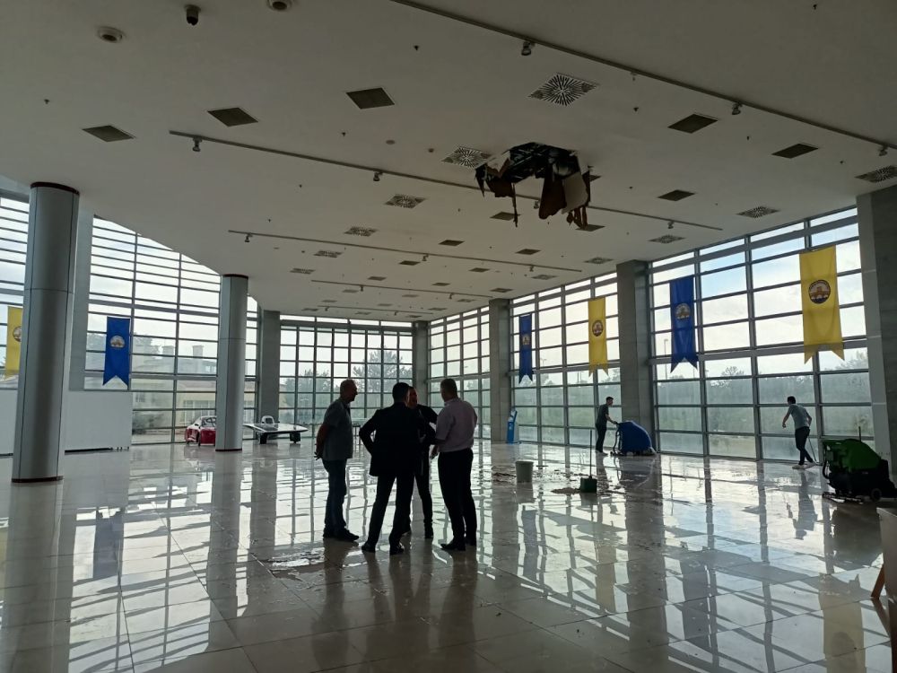 Edirne'de bugün dolu ile birlikte başlayan sağanak yağış, Trakya Üniversitesi Balkan Yerleşkesindeki Balkan Kongre Merkezi'nde hasara neden oldu.