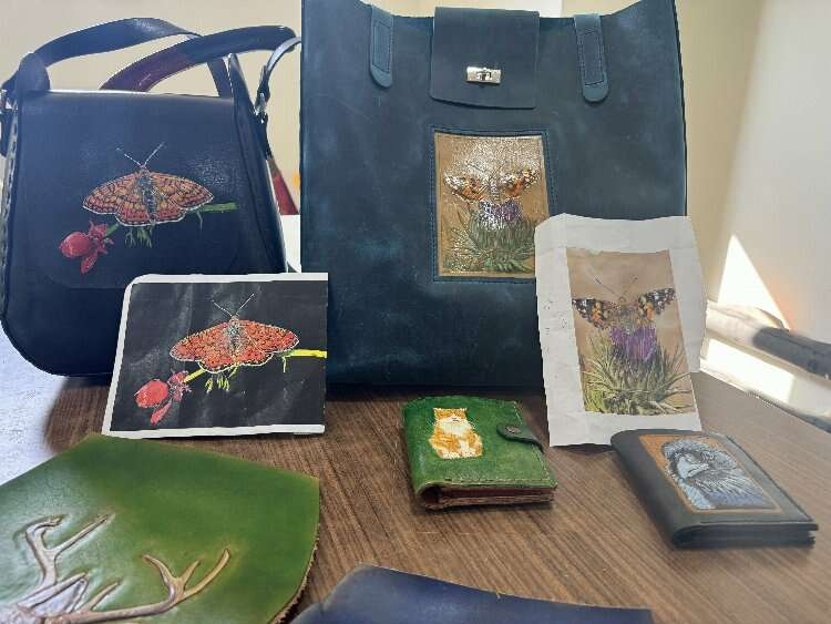 Tekirdağ'da yaşayan Serap Özsoy, eşinin makro fotoğrafladığı canlıları, tasarladığı deri ürünlerin üzerine resmediyor.