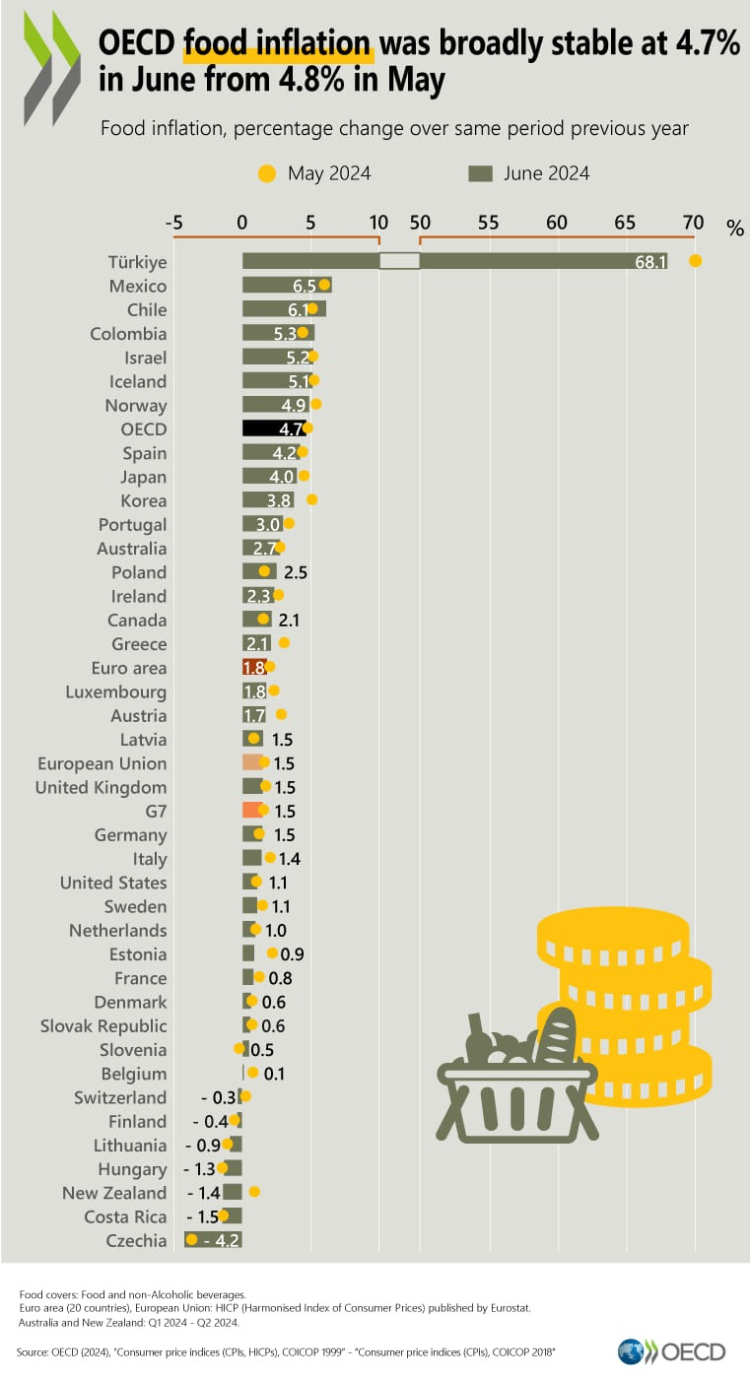 Cumhuriyet Halk Partisi (CHP) önceki dönem Edirne Milletvekili Doç. Dr. Okan Gaytancıoğlu, Ekonomik Kalkınma ve İş Birliği Örgütü’nün (OECD) 2024 yılı Mayıs ve Haziran aylarında yayımladığı gıda enflasyonunun bir önceki yılın aynı dönemine göre yüzde değişimi tablosunu sosyal medya hesabından paylaştı.