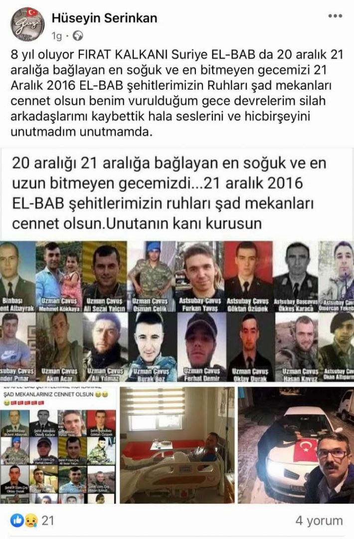 Dün akşam saatlerinde Milli Savunma Bakanlığı(MSB) Irak’ın Kuzeyi’nde bölücü terör örgütü mensupları tarafından yapılan saldırıda çatışma sonucu şehit düşen Mehmet Serinkan’ın 2016 yılında yaralanan ağabeyi Hüseyin Serinkan’ın bir gün önce sosyal medya hesabı üzerinden yaralandığı çatışmada şehit düşen arkadaşlarını yad ettiği görüldü.