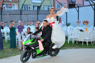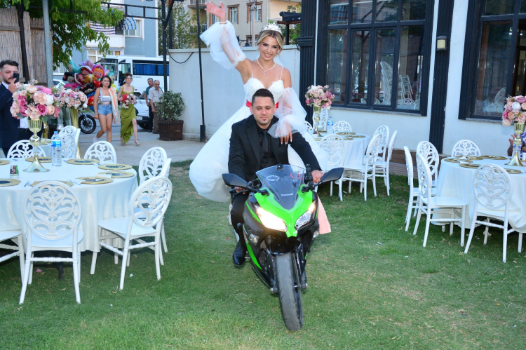 Salona alışılmışın dışında bir giriş yapan genç çifti görenler şaştı kaldı. Damat Gürcan İşbilen'in kullandığı, gelin Kübra Ayık'ın da arkasına oturduğu motosikletle salona giriş yapan çift, davetliler tarafından alkışla karşılandı. Kübra ve Gürcan çifti, salonda motosikletle tur atıp davetlileri selamladı.