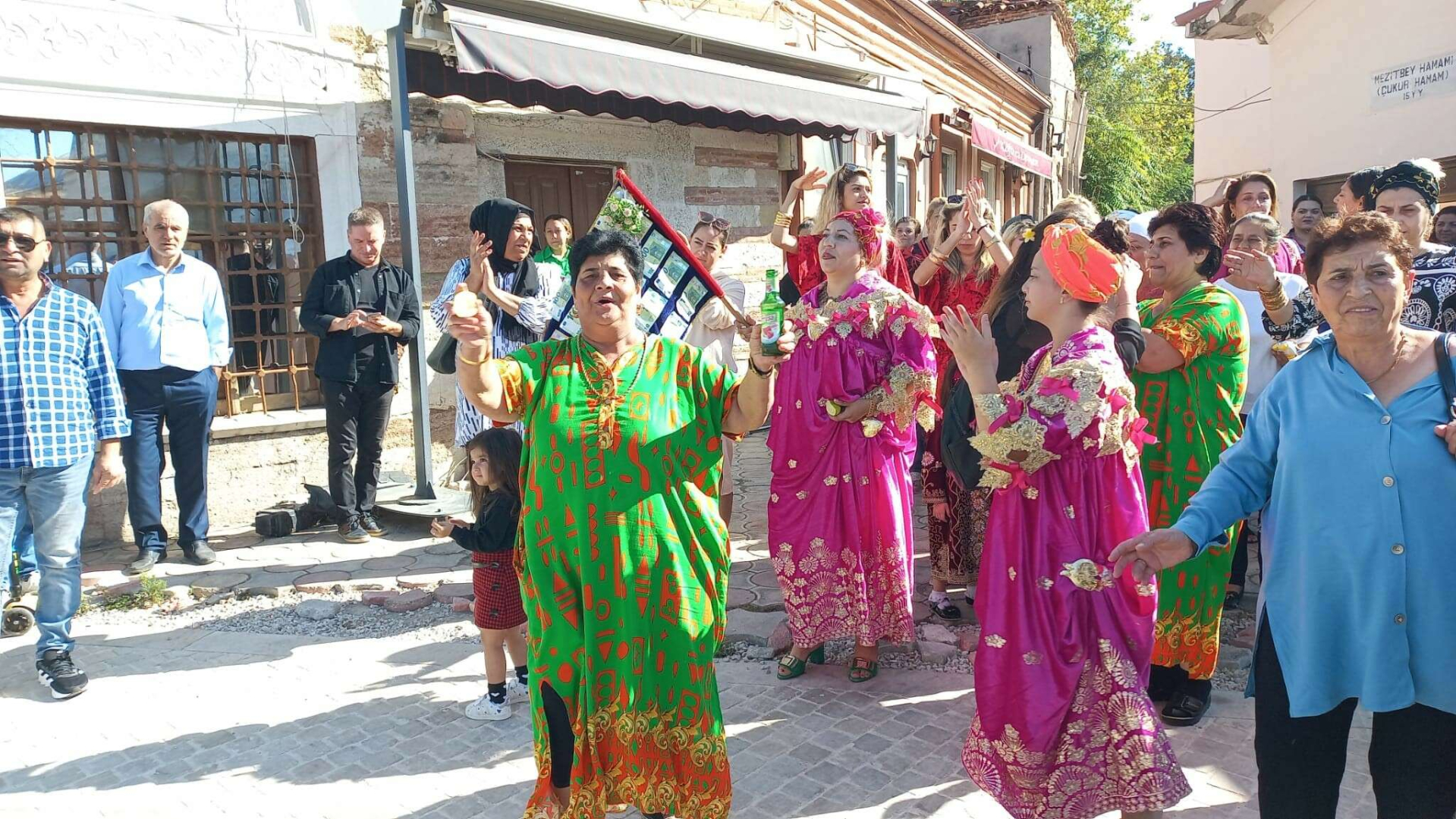 Selimiye Camisi'nin önünde bulunan hamama kadar, müzik eşliğinde oyunlar oynanıp geleneksel hamam töreni renklendirildi. Roman çifti görenler bu anı telefonlarına kaydederek eğlenceye eşlik etti. Damat evinden davul-zurna ve oyun havaları eşliğinde deve ile gelen gelin hamam giriş yaptı. Gelin ve damat merdiven yardımıyla deveden indirildi.