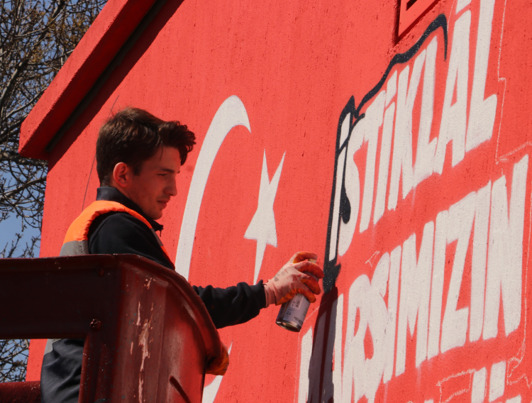 "Özel günlerde atıl duvarlarımızı değerlendiriyoruz. Şehrimizdeki kullanılmayan duvarları kent estetiğine uygun şekilde tasarlayıp çiziyorum. Şimdi 12 Mart İstiklal Marşı'nın yıl dönümü. Arkamda gördüğünüz duvarı da o güne özel bir çalışma olarak hazırladık. Bu tür özel günlere yönelik çalışmalarımız devam ediyor."