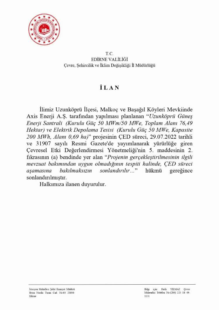 Duyuruda; “İlimiz Uzunköprü İlçesi, Malkoç ve Başağıl Köyleri Mevkiinde Axis Enerji A.Ş. tarafından yapılması planlanan ‘Uzunköprü Güneş Enerji Santrali (Kurulu Güç 50 MWm/50 MWe, Toplam Alanı 76,49 Hektar) ve Elektrik Depolama Tesisi (Kurulu Güç 50 MWe, Kapasite 200 MWh, Alanı 0,69 ha)’ projesinin ÇED süreci, 29.07.2022 tarihli ve 31907 sayılı Resmi Gazete'de yayımlanarak yürürlüğe giren Çevresel Etki Değerlendirmesi Yönetmeliği'nin 5. maddesinin 2. fıkrasının (a) bendinde yer alan ‘Projenin gerçekleştirilmesinin ilgili mevzuat bakımından uygun olmadığının tespiti halinde, ÇED süreci aşamasına bakılmaksızın sonlandırılır…” hükmü gereğince sonlandırılmıştır” ifadelerine yer verildi.
