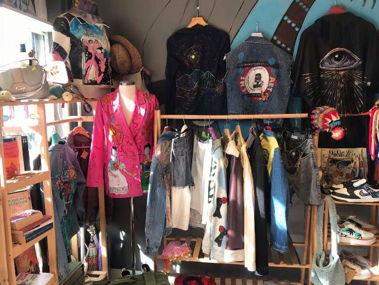 İşe öncelerinde kendi eşyalarını boyayarak başladığını söyleyen Ayas; “Yaklaşık 10 yıldır ben kıyafet boyuyorum. Önceleri evde boyuyordum. Önce kendi eşyalarımı boyayarak başladım. Ayakkabı, ceket gibi giyilebilir eşyaları boyadım. Hobi olarak başladım. Trakya Üniversitesi Gümrük İşletme mezunuyum. Hep kurumsal yerlerde çalıştım ama hep bir şeyler boyuyordum. Ortaokuldan beri çizim yapıyorum. Sonra tamamen kıyafet boyama geçtim. Tasarım işine başladım ve ürünlerimi Ulus Pazarı ve Kadın Üreticiler Pazarı’nda satmaya başladım. Edirne’nin festivallerinde yer aldım. Kakava ve Sarayiçi’nde yapılan birçok festivalde yer aldım. Sonrasında baktım eve sığmıyorum artık. Eşyalar çoğaldı, ürünler, boyalar çoğaldı. Pazarda satışlar artınca baktım büyüyor, bir atölyeye geçmek istedim. Bu dükkanı tesadüfen bulduk. Daha sonra evdeki bütün eşyaları atölyeye taşıdım. Hem atölye olsun hem satış yeri olsun ürünler kişinin gözü önünde dikilsin. Kişinin gözü önünde boyansın diye dikkat çekmek istedim. Serüven böyle başladı yaklaşık bir yıldır da atölyede hizmet vermekteyim” dedi.