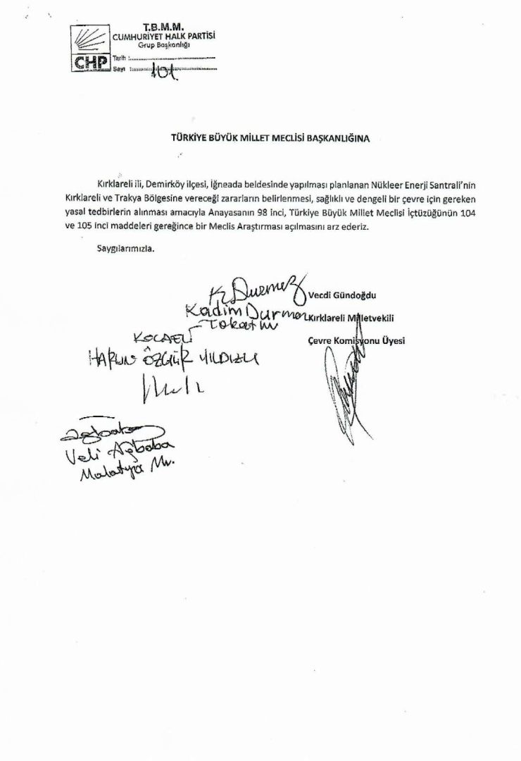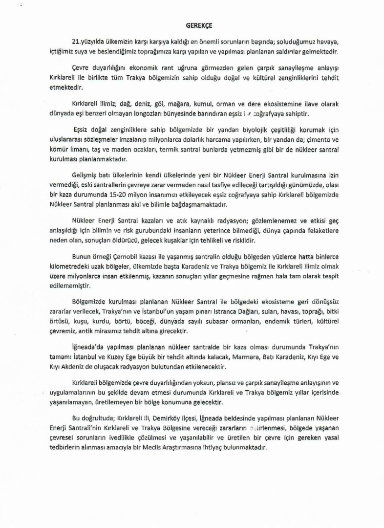 Gündoğdu, TBMM Başkanlığı’na verdiği önergede; “Kırklareli ili, Demirköy ilçesi, İğneada beldesinde yapılması planlanan Nükleer Enerji Santrali’nin Kırklareli ve Trakya Bölgesine vereceği zararların belirlenmesi, sağlıklı ve dengeli bir çevre için gereken yasal tedbirlerin alınması amacıyla Anayasanın 98 inci, Türkiye Büyük Millet Meclisi İçtüzüğünün 104 ve 105 inci maddeleri gereğince bir Meclis Araştırması açılmasını arz ederiz” sözlerine yer verdi.