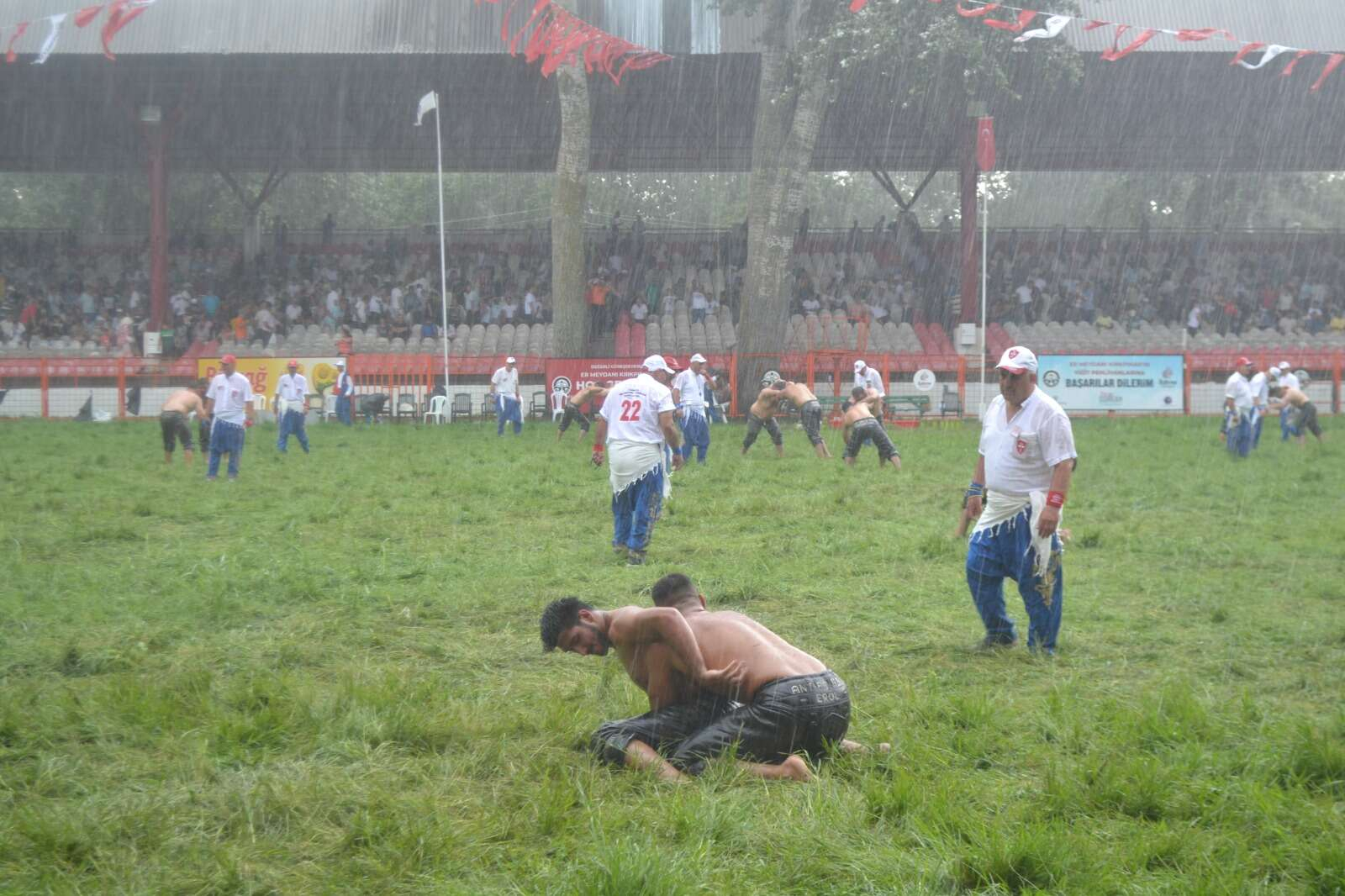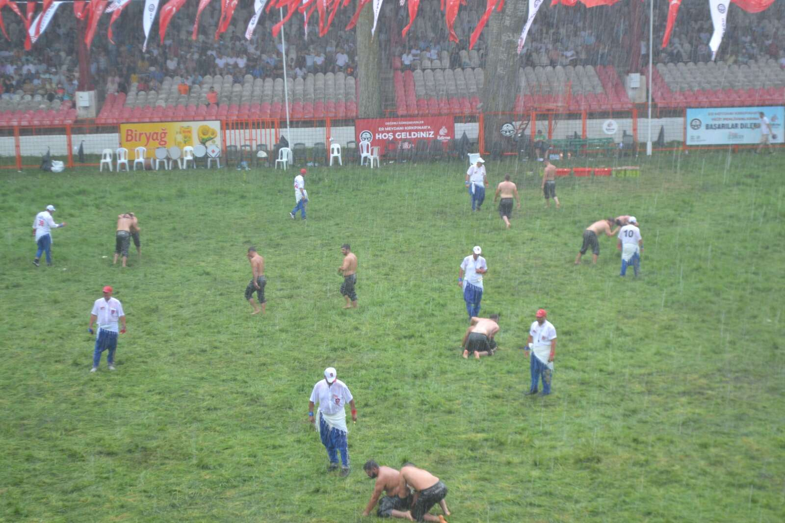 Sıcaktan bunalan pehlivanlar öğle saatlerinin ardından bir anda başlayan yağışla serinlerdi.