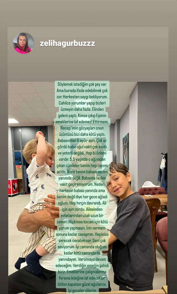 “Söylemek istediğim çok şey var. Ama burada ifade edebilmek çok zor. Herkesten saygı bekliyorum. Cahilce yorumlar yapıp bizleri üzmeyin daha fazla. Elinden geleni yaptı. Kimse çıkıp eşimin emeklerine laf edemez. Ettirmem. Recep’imin gözyaşları onun üzüntüsü bizi daha kötü yaptı. Babasından 6 aydır ayrı. Çok az gördü baba oğul vakti çok kısıtlı ve yeterli değildi. Hep bir özlem vardı. 5.5 yaşında o ağzından çıkan cümleler benim hep canımı acıttı. Anne benim babam neden yanımda değil. Babamla neden vakit geçiremiyorum. Neden herkesin babası yanında ama benim değil diye her gece ağladı oğlum. Hep hırçın davrandı. Ali için ayrı zordu. Ailesinden evlatlarından uzak uzun bir zaman. Hiç kimse kocam için kötü yorum yapmasın. İzin vermem sonuna kadar savaşırım. Hepinize verecek cevabım var. Seni çok seviyorum. İyi zaman da olduğum kadar kötü zamanda da yanındayım. Var olmaya devam edeceğim. Verdiğin emeğin şahidi biziz. Emeklerine, çalışmalarına hırsına isteğine laf edecekler lütfen kapatsın güzel ağzını”