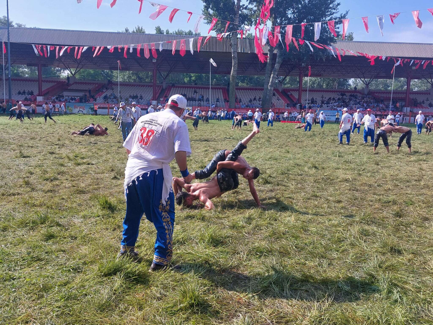Yağlı güreşlerin 2. gününde dualı çayıra çıkan güreşçiler güreşmeye saat 9.00’dan itibaren başladı. Dünün aksine daha bulutlu ve ılık havanın hakim olduğu sahada ilk başta alt boyların güreşiyor. Baş pehlivanların 12.00’de yapılacak kura çekiminin ardından Er Meydanı’na çıkması bekleniyor.
