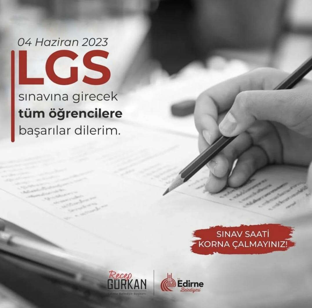 Edirne Belediye Başkanı Recep Gürkan 04.06.2023 tarihinde gerçekleşecek Liseye Geçiş Sınavı (LGS) dolayısıyla sınava giren öğrencilere başarılar dileyerek sınav saatinde korna çalınmaması gerektiğini hatırlattı. Gürkan “Sizler geleceğin bir gülü, yıldızı ve ikbal ışığısınız. Yarın gerçekleştirilecek olan LGS sınavına katılacak olan geleceğimizin teminatı tüm öğrencilere başarılar diliyorum. Sevgili çocuklarım sonuç ne olursa olsun aydınlık bir gelecek sizlerle olsun. Sizler hepiniz geleceğin bir gülü, yıldızı ve ikbal ışığısınız. Memleketi asıl ışığa boğacak olan sizlersiniz. Yolunuz her daim açık olsun, iyi ki varsınız” dedi.