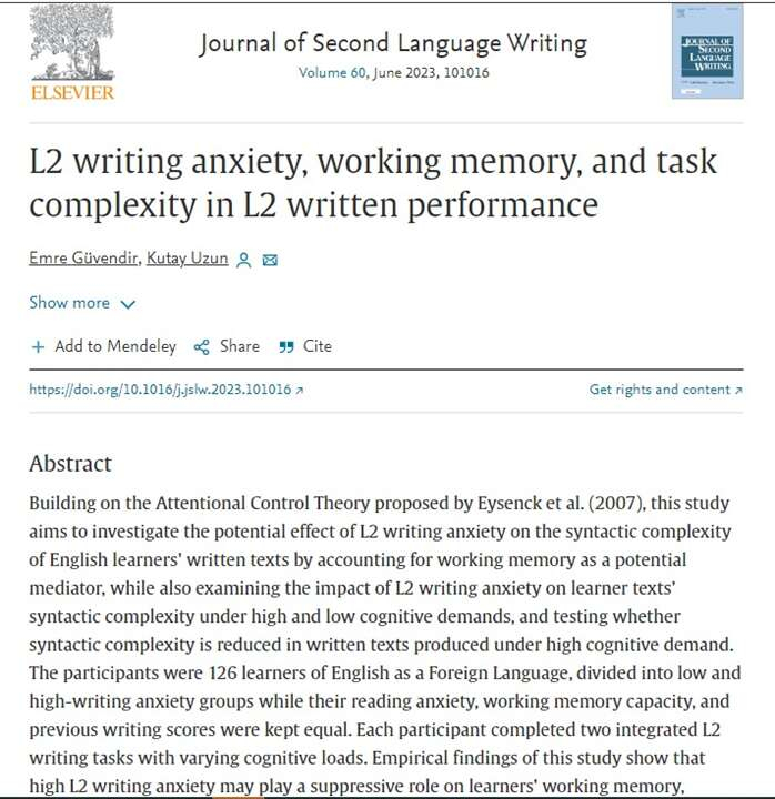Trakya Üniversitesi Eğitim Fakültesi Yabancı Diller Eğitimi Bölümü öğretim üyeleri Doç. Dr. Emre Güvendir ve Doç. Dr. Kutay Uzun’un ortaklaşa gerçekleştirdikleri “L2 writing anxiety, working memory, and task complexity in L2 written performance” başlıklı çalışma, dünyanın en prestijli dergilerinden Journal of Second Language Writing’te yayımlandı.