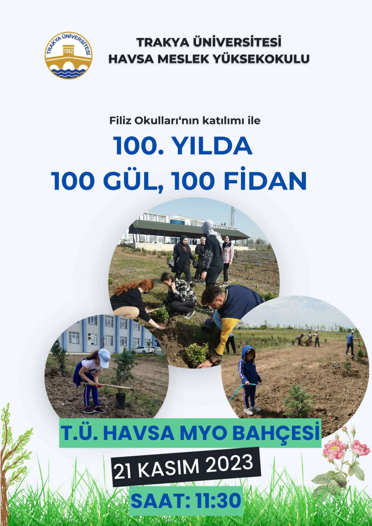 Trakya Üniversitesi Havsa Meslek Yüksekokulu Cumhuriyetin 100. Yılında, 100 gül ve 100 fidan sloganı ile gerçekleştireceği ağaçlandırma çalışması 22 Kasım 2023 tarihinden 21 Kasım 2023 tarihine çekildi.