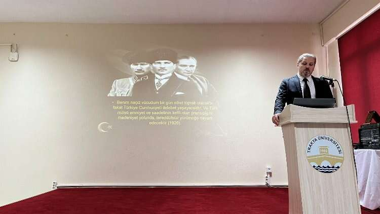 Cumhuriyet Bayramı haftasında planlanan “Cumhuriyet Yolunda 100 Yıl, Anlamak ve Yaşamak” isimli konferans Trakya Üniversitesi Atatürk İlkeleri ve İnkılap Tarihi Araştırma ve Uygulama Merkezi Müdür Yardımcısı Öğr. Gör. Dr. Tarık Sarıoğlu Tarafından verildi.