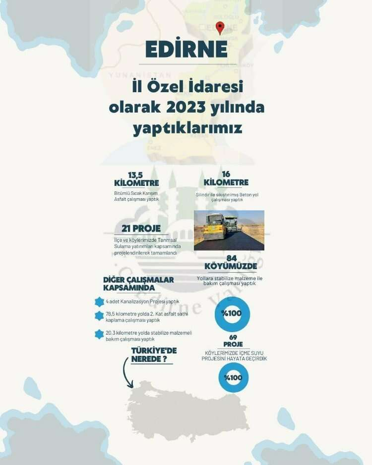 Valilikten yapılan açıklamada; “Edirne Valiliği İl Özel İdaresi olarak 2023 yılında 13,5 kilometre sıcak asfalt, 16 kilometre beton yol çalışması, 21 tarımsal sulama yatırımları kapsamındaki projeler, 84 köyümüzde yol bakım çalışması, 69 proje ile köylerimizde içme suyu ile ilgili çalışmalar yaptık” ifadelerine yer verildi.