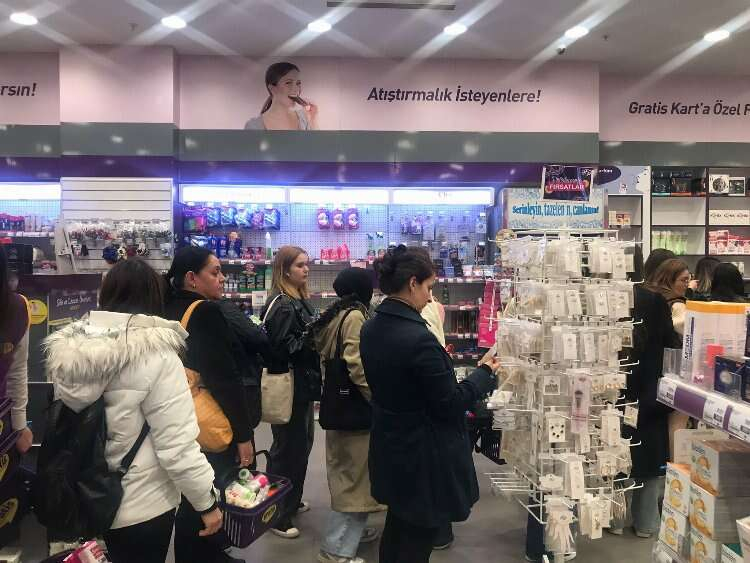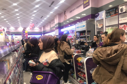 Bu özel indirimlerle birlikte alışveriş merkezinde bulunan mağazada uzun kuyruk oluştu. Kadınlar, kozmetik ürünlerde sunulan avantajlı fiyatları kaçırmamak için mağazaya akın etti.