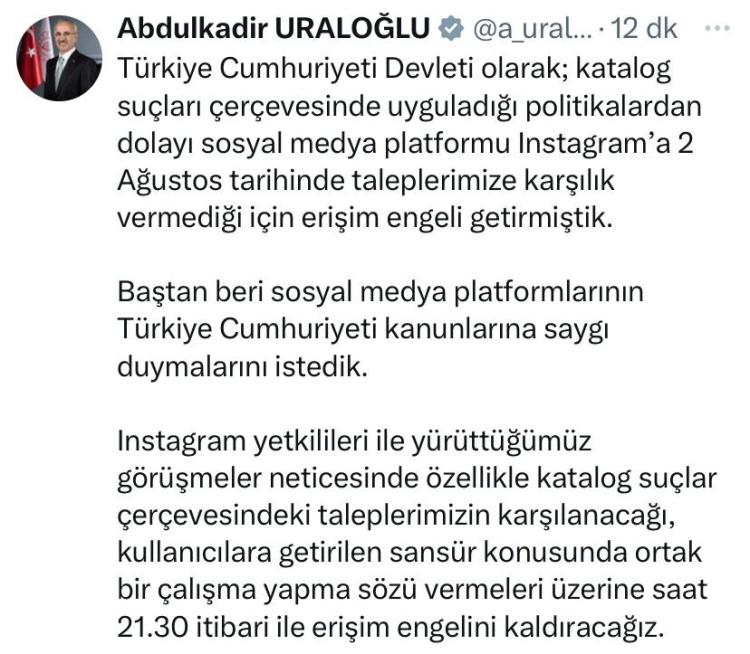 Bakan Uraloğlu, yaptığı açıklamada şu ifadeleri kullandı; “Türkiye Cumhuriyeti Devleti olarak; katalog suçları çerçevesinde uyguladığı politikalardan dolayı sosyal medya platformu Instagram’a 2 Ağustos tarihinde taleplerimize karşılık vermediği için erişim engeli getirmiştik. Baştan beri sosyal medya platformlarının Türkiye Cumhuriyeti kanunlarına saygı duymalarını istedik. Instagram yetkilileri ile yürüttüğümüz görüşmeler neticesinde özellikle katalog suçlar çerçevesindeki taleplerimizin karşılanacağı, kullanıcılara getirilen sansür konusunda ortak bir çalışma yapma sözü vermeleri üzerine saat 21.30 itibari ile erişim engelini kaldıracağız.