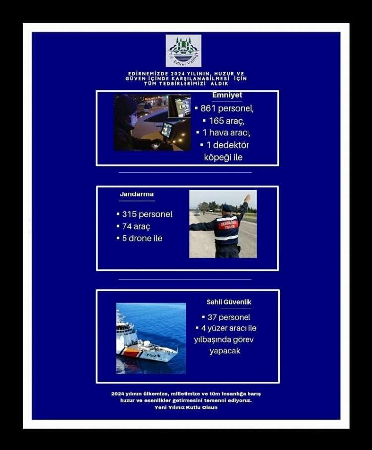 Edirne Valiliği, 2024 yılının huzur ve güven içerisinde karşılanabilmesi için tedbirlerin alındığını duyurdu.