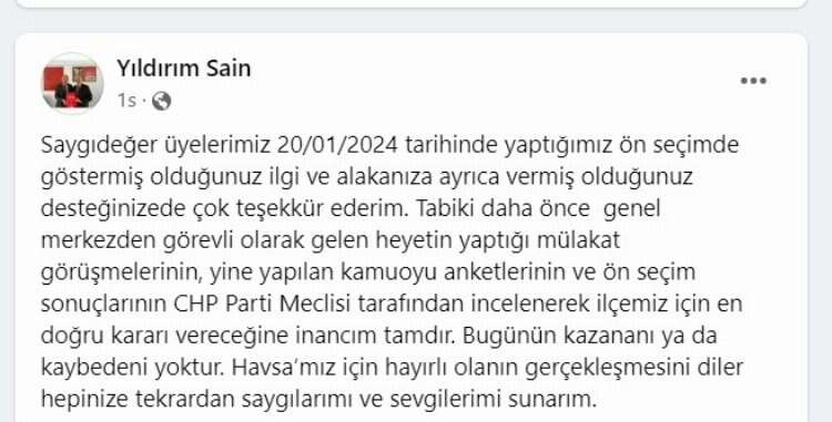 Sain paylaşımında, “Saygıdeğer üyelerimiz 20.01.2024 tarihinde yaptığımız ön seçimde göstermiş olduğunuz ilgi ve alakanıza ayrıca vermiş olduğunuz desteğinize de çok teşekkür ederim. Tabi ki daha önce genel merkezden görevli olarak gelen heyetin yaptığı mülakat görüşmelerinin, yine yapılan kamuoyu anketlerinin ve ön seçim sonuçlarının CHP Parti Meclisi tarafından incelenerek ilçemiz için en doğru kararı vereceğine inancım tamdır. Bugünün kazananı ya da kaybedeni yoktur. Havsa’mız için hayırlı olanın gerçekleşmesini diler hepinize tekrardan saygılarımı ve sevgilerimi sunarım” dedi.