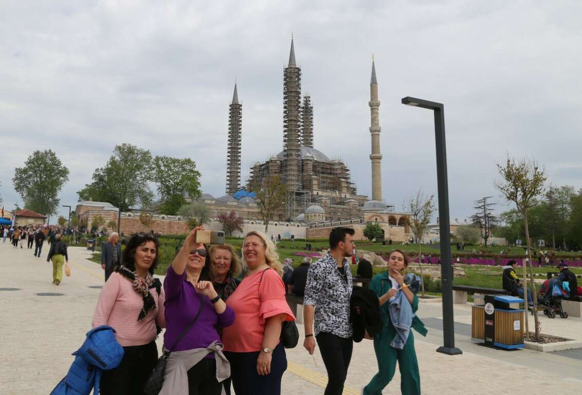 Tur kafilelerinin otobüse biniş noktası olan Selimiye Meydanı önünde yoğunluk oluşturan ziyaretçiler restorasyonun sürdüğü Selimiye Camisi manzarasıyla fotoğraf çektirdi.