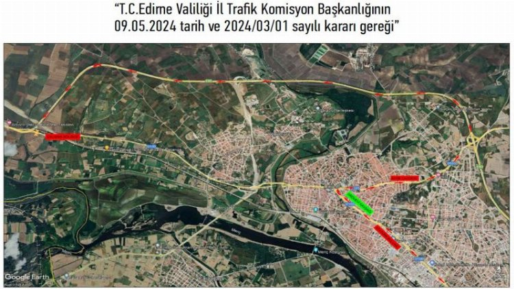 Edirne Belediyesi Ulaşım Hizmetleri Müdürlüğü’nden yapılan yazılı açıklamada şunlara yer verildi; “TC Edirne Valiliği İl Trafik Komisyon Başkanlığının 09.05.2024 tarih ve 2024/03-01 sayılı kararı gereği; Atatürk Caddesi (D-100 Karayolu-Batı Girişi) Kapıkule Yolu Caddesi (KM 219-182) üzerinde bulunan demiryolu üst geçidinde yapılacak yüksek hızlı tren (YHT) çalışmaları sebebi ile çalışma yapılacak demiryolunun bulunduğu nokta, Kapıkule istikametinde 1 (bir) ay süre ile geçişlere kapatılacaktır. Bu sebeple şehre girişler Süloğlu-Lalapaşa (Kuzey Girişi-Kıyık) istikametinden yapılacaktır. Çalışmalar esnasında; çalışanların ve sürücülerin güvenliği ve konforu için trafik kurallarına riayet etmeniz önemle rica olunur.”