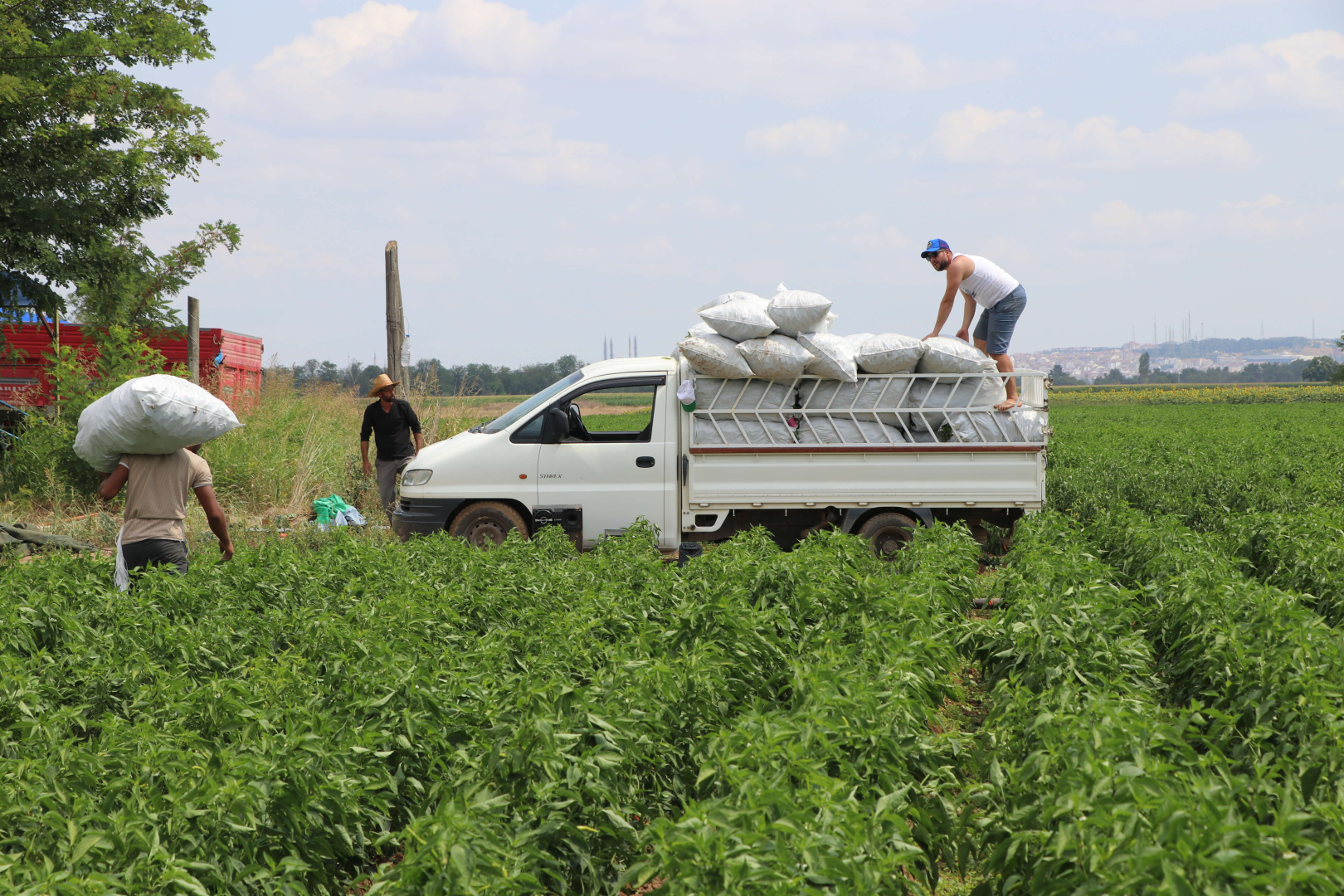 Karaağaç Mahallesi'nde yaklaşık 200 dekarlık alanda ekilen acı biberi toplamak için çiftçiler tarlalara girdi, bu yıl yaklaşık 250 ton ürün hasat edilmesi öngörülüyor.