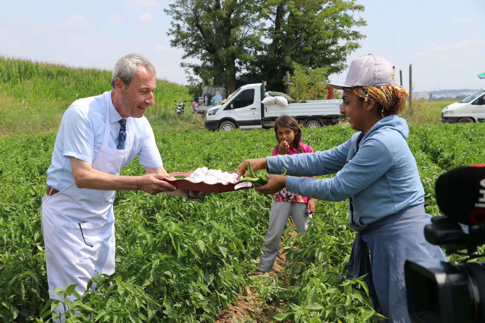 İlk hasat gününde çalışanları ziyarete geldiklerini ifade eden Dinar, "Acı biber toplayan kardeşlerimize tatlı ikram ettik. 3 nehrin geçtiği bir yerde karaağaç tohumuyla ekilen biber, dünyanın başka hiçbir yerinde yetişmiyor. Bu acılığı vermiyor, memleketimizde çok biber yetişiyor ama böyle tatlı bir acı yok." diye konuştu.